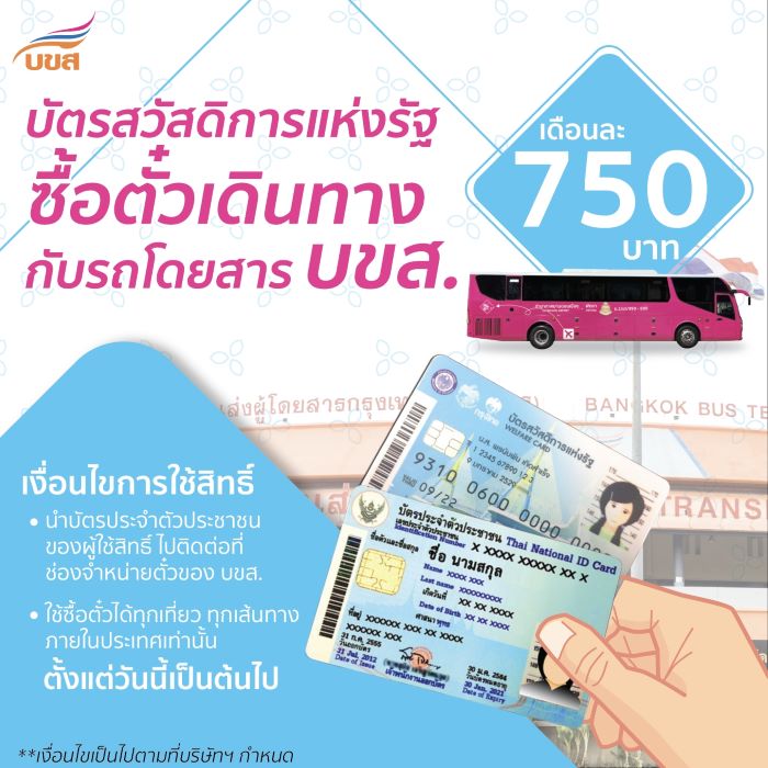 บขส. จึงขอเชิญชวนประชาชนสามารถใช้บัตรสวัสดิการแห่งรัฐ ตามโครงการของรัฐบาลที่ให้ประชาชนจ่ายค่าเดินทางผ่านระบบขนส่งสาธารณะ จำนวน 750 บาทต่อคนต่อเดือน โดยประชาชนนำบัตรสวัสดิการแห่งรัฐซื้อตั๋วโดยสารได้ที่ช่องจำหน่ายตั๋วของ บขส. ทั่วประเทศ