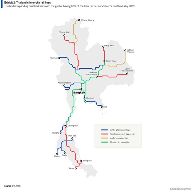 บริษัทหลักทรัพย์ เกียรตินาคินภัทร จำกัด (มหาชน) ชี้ประเทศไทยกำลังอยู่ในช่วงของการยกเครื่องระบบรางรถไฟครั้งใหญ่ที่สุดในรอบหลายทศวรรษ ซึ่งถือเป็น “การปฏิรูประบบรางแห่งชาติ” ที่จะเปลี่ยนโฉมการขนส่งของประเทศทั้งระบบ โครงการนี้ครอบคลุมการสร้างรางคู่ทั่วประเทศและการออกกฎหมายใหม่ที่เปิดทางให้ภาคเอกชนเข้ามามีบทบาทมากขึ้น คาดว่าจะช่วยลดต้นทุนโลจิสติกส์ เสริมศักยภาพการแข่งขัน เพิ่มการเติบโตของเศรษฐกิจ และกระตุ้นรายได้ของเมืองรองและชุมชนเล็ก ๆ ตามแนวเส้นทางรถไฟ