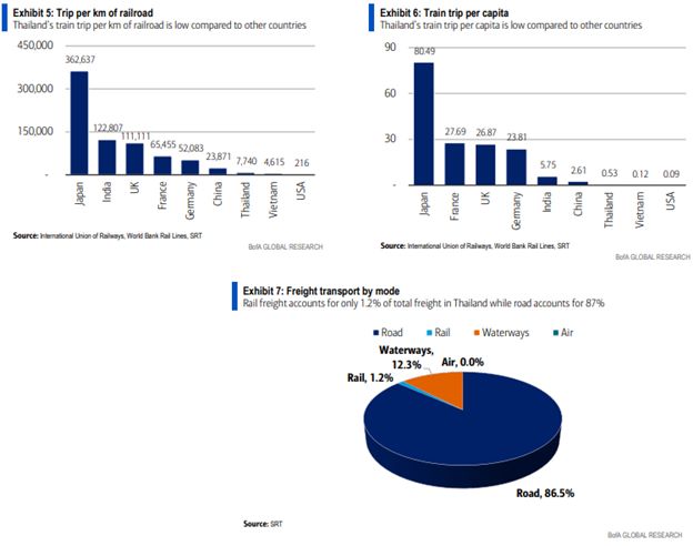 ไทยยังใช้ระบบรางน้อยกว่าที่ควร โดยมีสัดส่วนการขนส่งสินค้าทางรางเพียงประมาณ 1% ของทั้งหมด ซึ่งต่ำกว่าประเทศพัฒนาแล้วหลายเท่า สาเหตุหลักมาจากข้อจำกัดด้านงบลงทุนและหนี้สินสูงของ การรถไฟแห่งประเทศไทย (รฟท.) ที่มีหนี้สุทธิราว 471,000 ล้านบาท ทำให้ขาดงบประมาณในการปรับปรุงขบวนรถและระบบบริการให้ทันสมัย