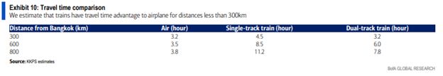 เครื่องบินแม้จะมีความเร็วสูงกว่า (700-900 กม./ชม.) แต่ต้องใช้เวลาคงที่ในการเดินทางไปสนามบิน เช็กอิน โหลดกระเป๋า และรอขึ้นเครื่อง ซึ่งโดยเฉลี่ยใช้เวลารวมราว 2 ชั่วโมงต่อเที่ยว ดังนั้น รถไฟจะเริ่มได้เปรียบด้านเวลาเมื่อระยะทาง ไม่เกิน 300 กิโลเมตรจากกรุงเทพฯ เช่น กรุงเทพฯ-หัวหิน หรือ กรุงเทพฯ-นครราชสีมา ที่สามารถเดินทางตรงถึงใจกลางเมืองโดยไม่ต้องเสียเวลาขั้นตอนก่อนออกเดินทางเหมือนเครื่องบิน