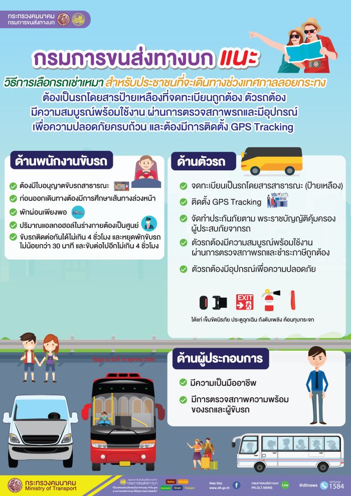 กรมการขนส่งทางบก แนะ!! วิธีการเลือกรถเช่าเหมา สำหรับประชาชนที่จะเดินทางช่วงเทศกาลลอยกระทง ต้องเป็นรถโดยสารที่จดทะเบียนอย่างถูกต้อง ตัวรถต้องเป็นรถที่มีมาตรฐานติดตั้งระบบ GPS Tracking เตือน!!! ควรตรวจสอบประวัติรถและคนขับทุกครั้งก่อนการว่าจ้าง วางแผนการเดินทางอย่างเหมาะสม และใช้ความเร็วตามที่กฎหมายกำหนด